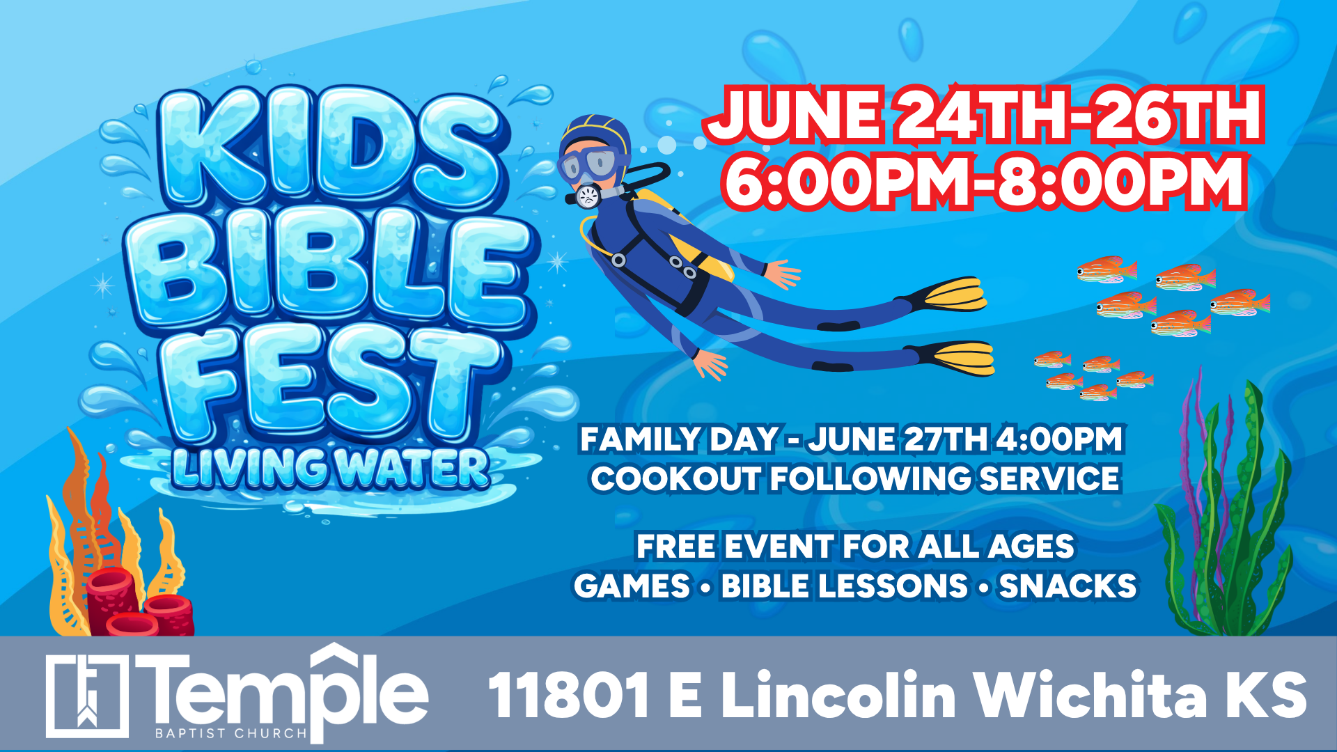 Join us for Kids Bible Fest, an exciting week filled with fun, friends, and faith! Each night, kids of all ages will enjoy games, candy, snacks, singing, and learning Bible verses. We'll also have a special Bible lesson each night focused on the theme of water throughout Scripture--helping kids understand how Jesus is the Living Water. Wednesday-Friday 6:00 PM - 8:00 PM Drop-off and pick-up available Saturday 4:00 PM Family cookout, games, and a Bible lesson for everyone Bring the whole family and come be part of a fun-filled week centered on God's Word!